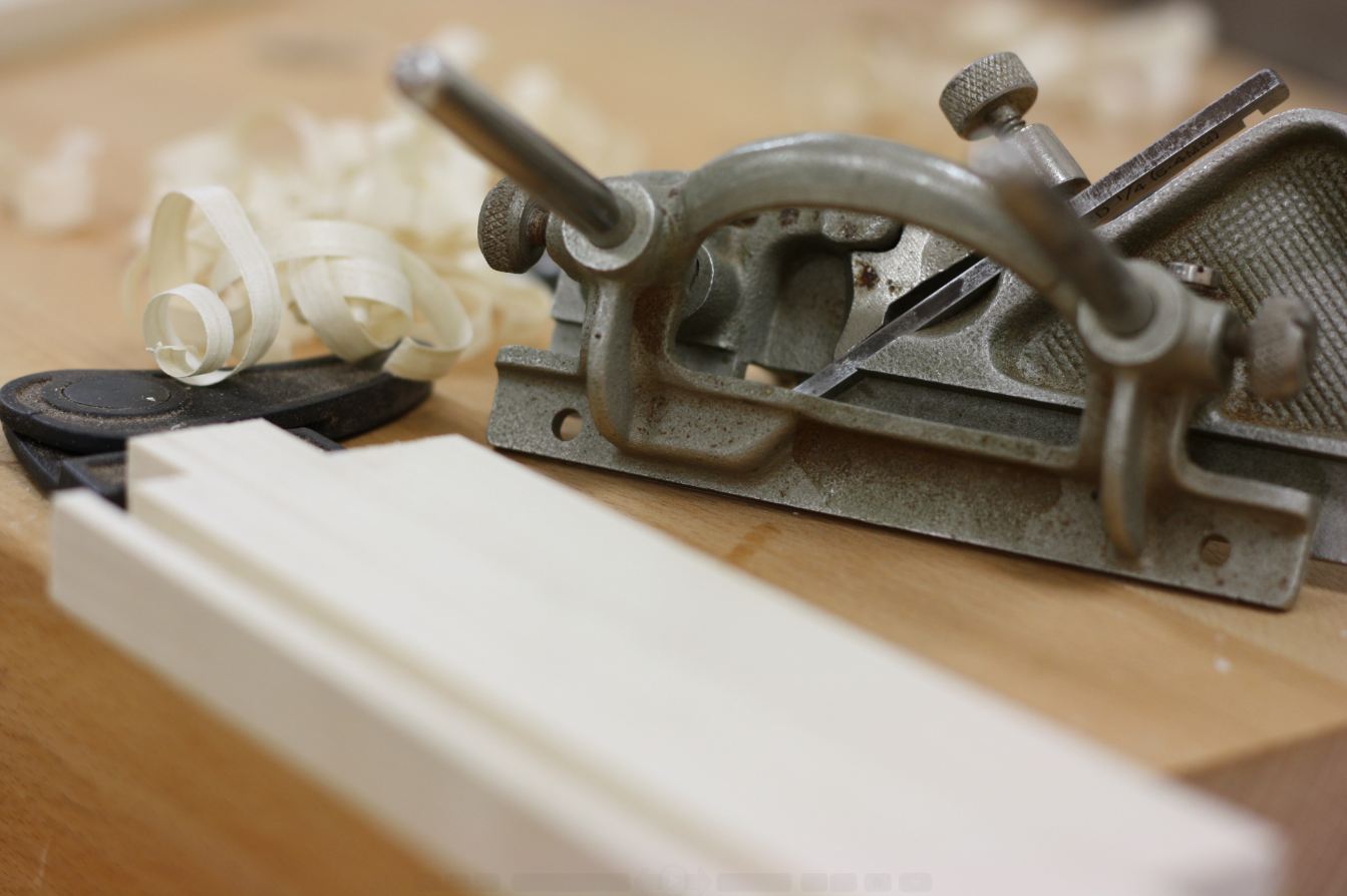 While the bottoms were curing, I smoothed the sides (see first image) and prepped them for cutting a groove for the bottom board. The short ends are the easy bits – just run the ol’ Record 043 across the bottom of the inside face until it stops cutting. But the longer sides (the front and back of the box) are going to be a little harder, because I can’t run the plane all the way across its length – I’ll end up with grooves showing on the protruding pins. So they need to be stopped grooves. That’s easy to do when you’re using a router table. It isn’t quite so easy when you’re using an 043.