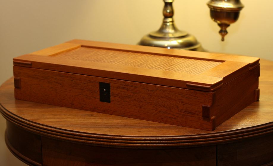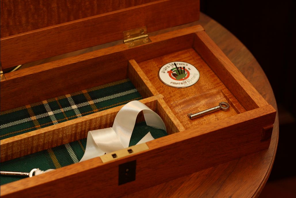 Materials: Mahogany, Curly Mahogany panel, Bog Oak escutcheon, Irish National tartan lining, Brusso brass hinges, English half mortise box lock from Whitechapel Ltd.