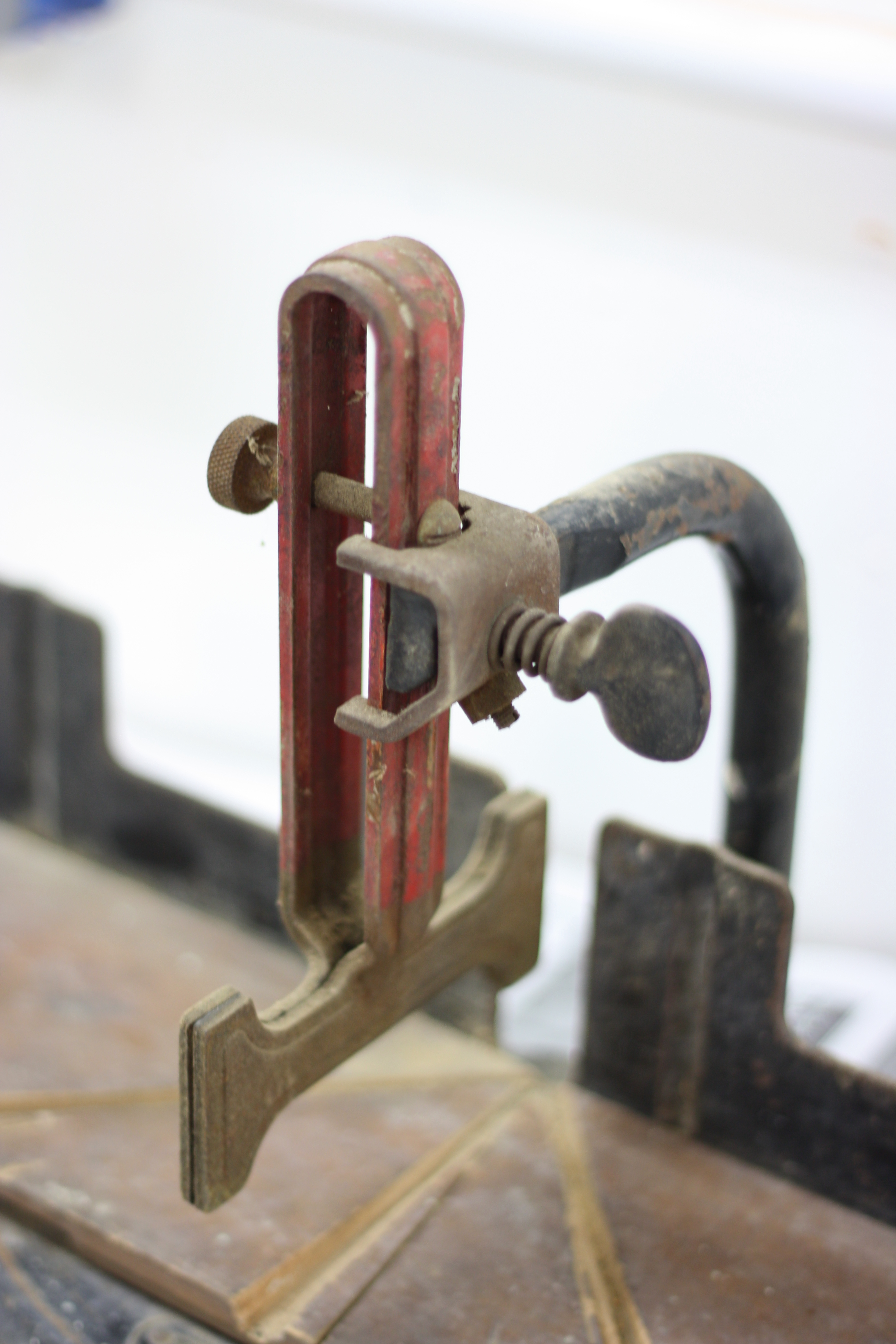 I set the saw aside and turned my attention to the miter box. As the plate in the front says, it is a Craftsman 3646 Miter Box. Apparently my Google-Fu is rusty, because I couldn’t find much at all on this model on the interwebz. It is similar in style to the Stanley 150 in that it guides the saw by clamping the blade into position. Height is adjusted by loosening the bracket at the end of the clamp arm and raising or lowering the clamping mechanism.