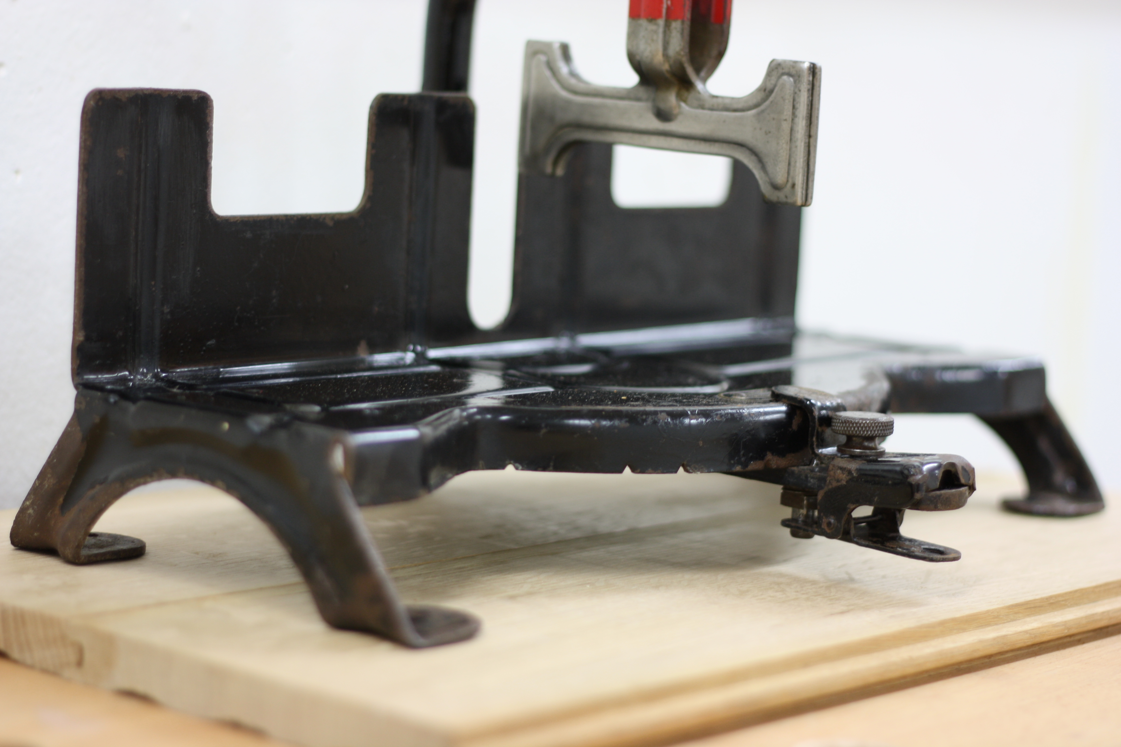 Great article! I’ve come across two of these: One Craftsman box just like yours, and an identical model from Millers Falls. I think these Steel models are more durable than the cast-iron-based Stanley No. 150 models. I didn’t see a photo from the rear of your miter box. There should be a fat pin through the vertical part of the pivot-arm, which provides a mounting place for a little wood wheel, just like the Stanley 150’s have to keep the miter-saw from dipping too low. One of my Craftsman boxes had this pin broken off. I was able to drill & tap a 10-32 bolt into that broken pin, to mount a wooden wheel. Enjoy!