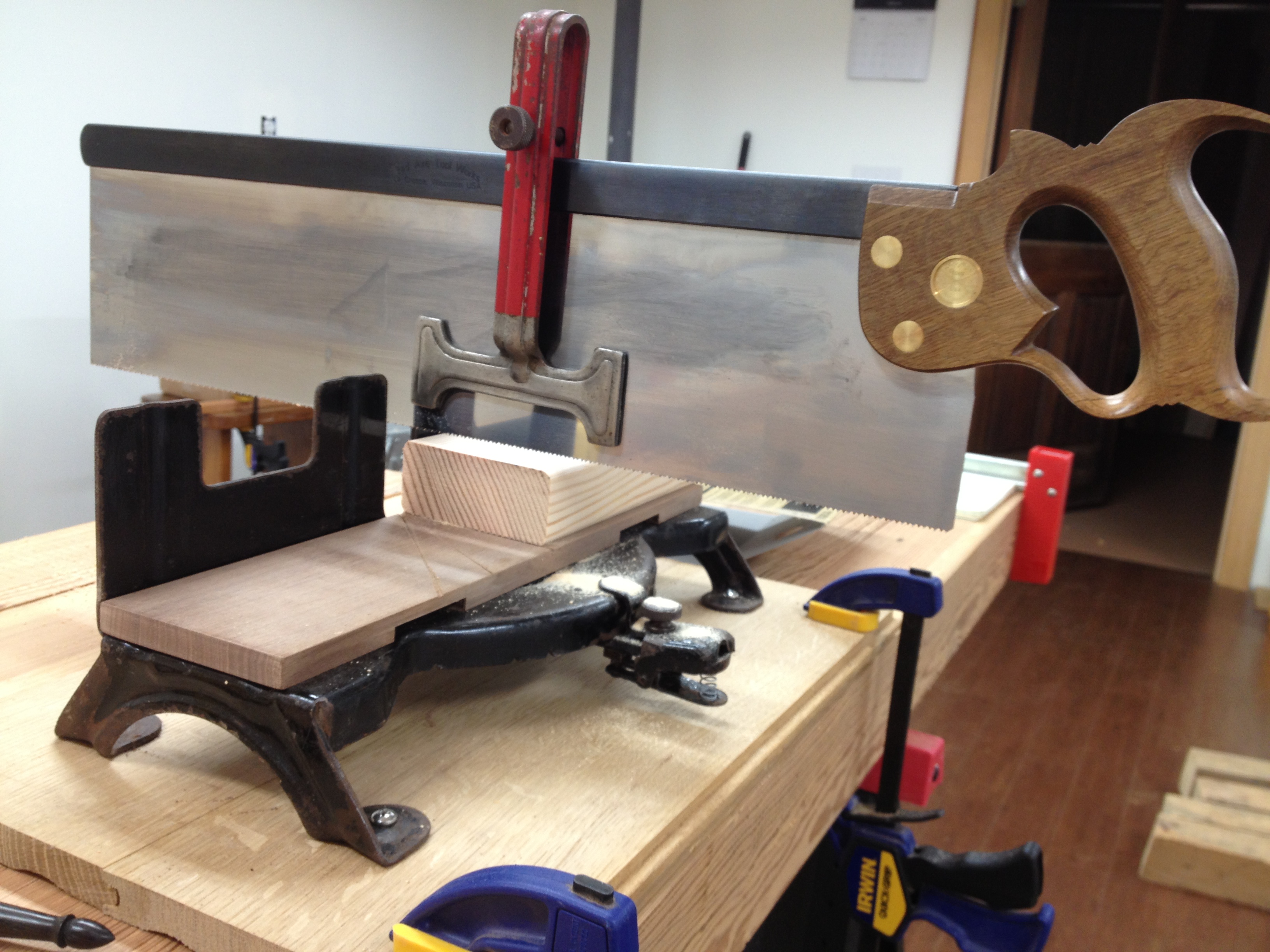 As you can see, the not-even-glued-up top is already getting put to good use, as is my Bad Axe miter saw and my newly restored Craftsman 3646 miter box.