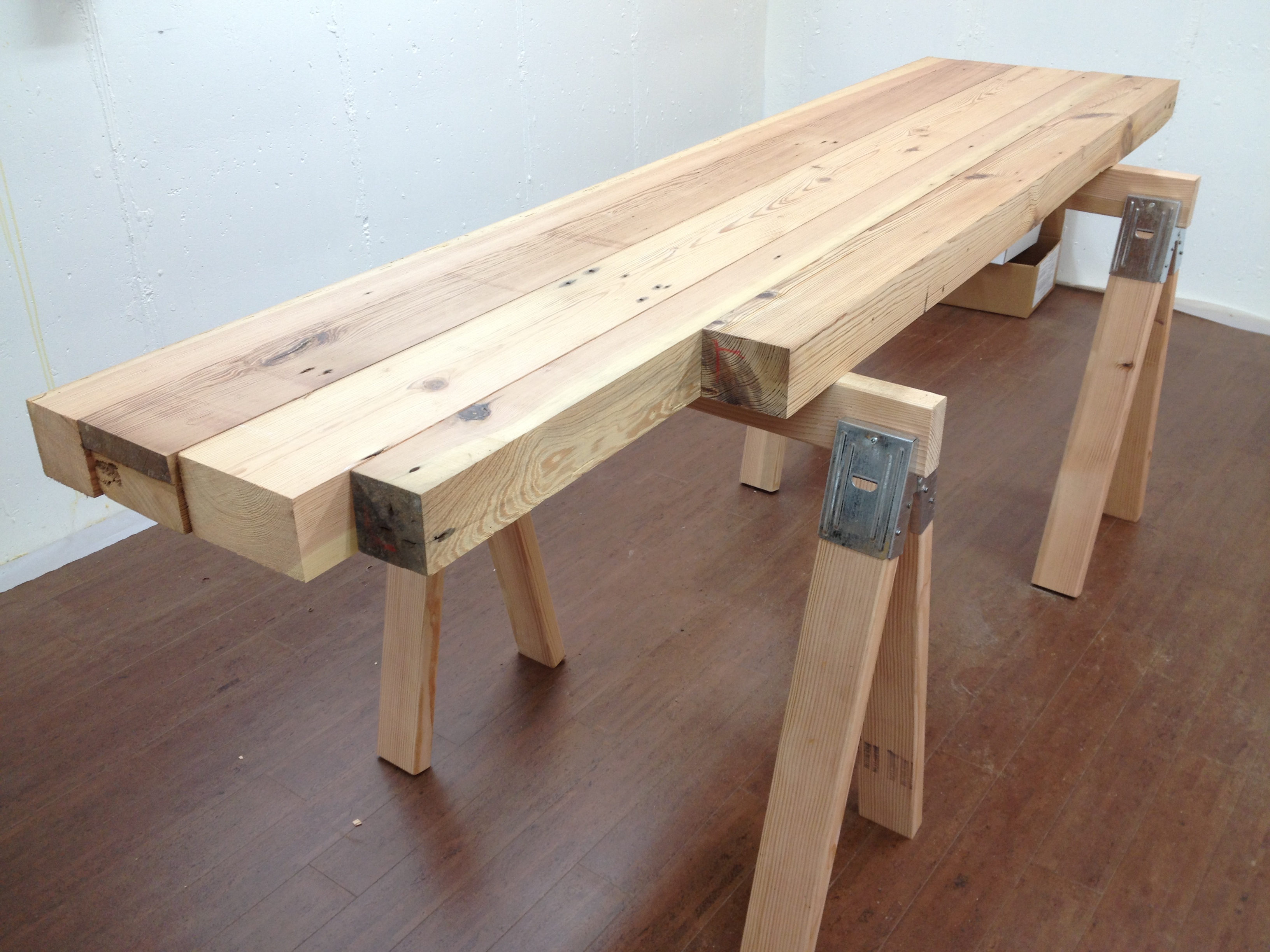 At any rate, as I was working on the top layout, I noticed my plastic saw horses were bowed, taxed probably close to their limit. They are fine for laying a door across when I’m painting it, but a bench top that weighs several hundred pounds might be pushing it. So I decided to throw together some quick saw horses. Quick, as in I was going to make them with the metal brackets where you just have to cut some 2×4 to length and nail them into the slots and then cut a piece for a cross beam.