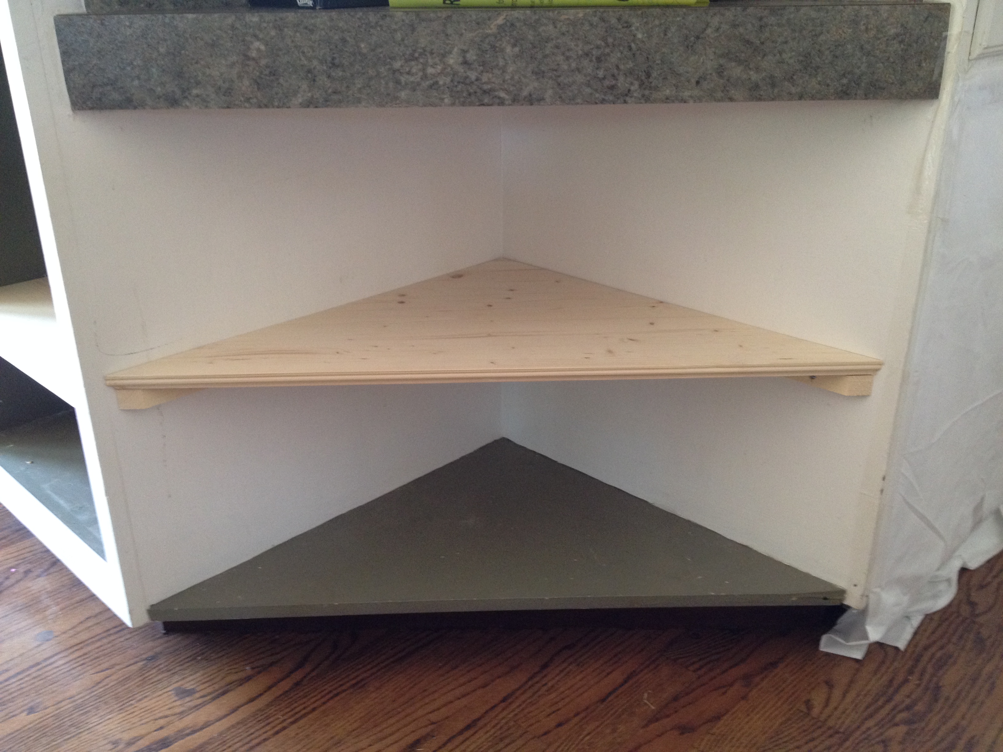 I took a bit of time making sure the wood I used had clear front edges and then cut them to size with hand saws. I used the bandsaw to rip some cleats and cleaned everything up with hand planes. I was a little unsure of one of the shelves – the large triangular one destined for a space just next to where the wine rack used to be. The vertex opposite the hypotenuse (oh, Geometry, how I’ve missed you!) was just a bit off of 90 degrees, but after thinking it through, I was confident I could get it close and then work on it in situ for a proper fit.