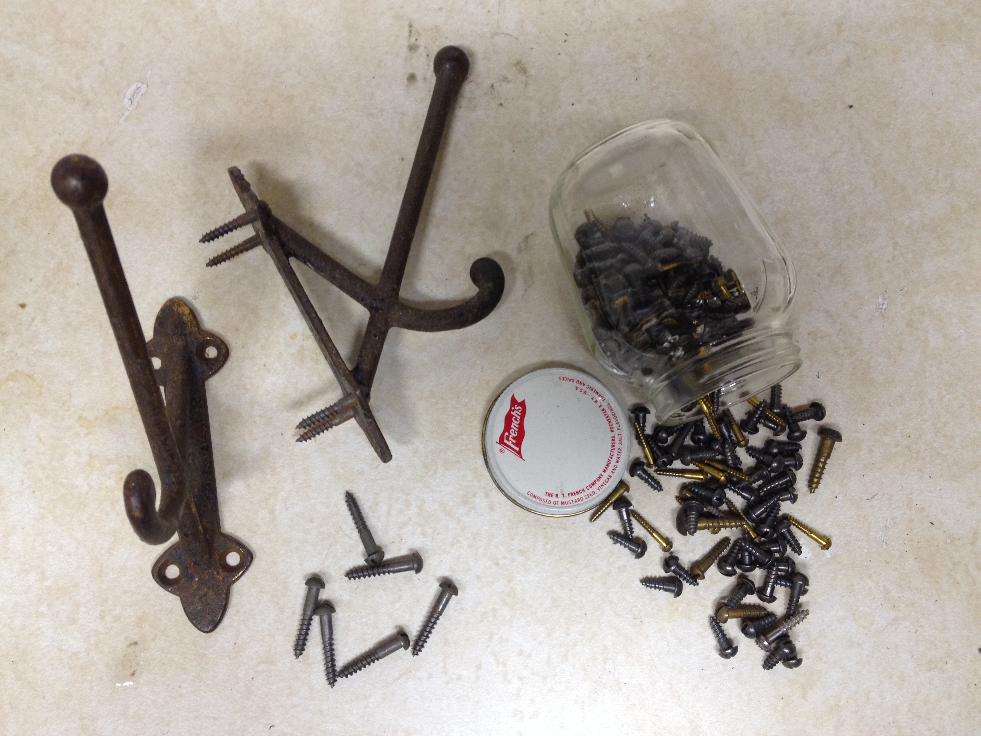 I pulled out the first coat hook and screws and laid them out next to the second one and pondered them for a bit, as I’m wont to do in such situations. And then I remembered the old French’s Mustard jar of screws I’d considered getting rid of just the week before. I grabbed it off of the clutter-bench, poured the screws out onto my sharpening counter, and sorted through them. And then cackled in glee as I found SIX (6) screws that exactly match the other four! Mine took a bath in Evaporust after I got them, so they have a nicer matte grey look to them, but…