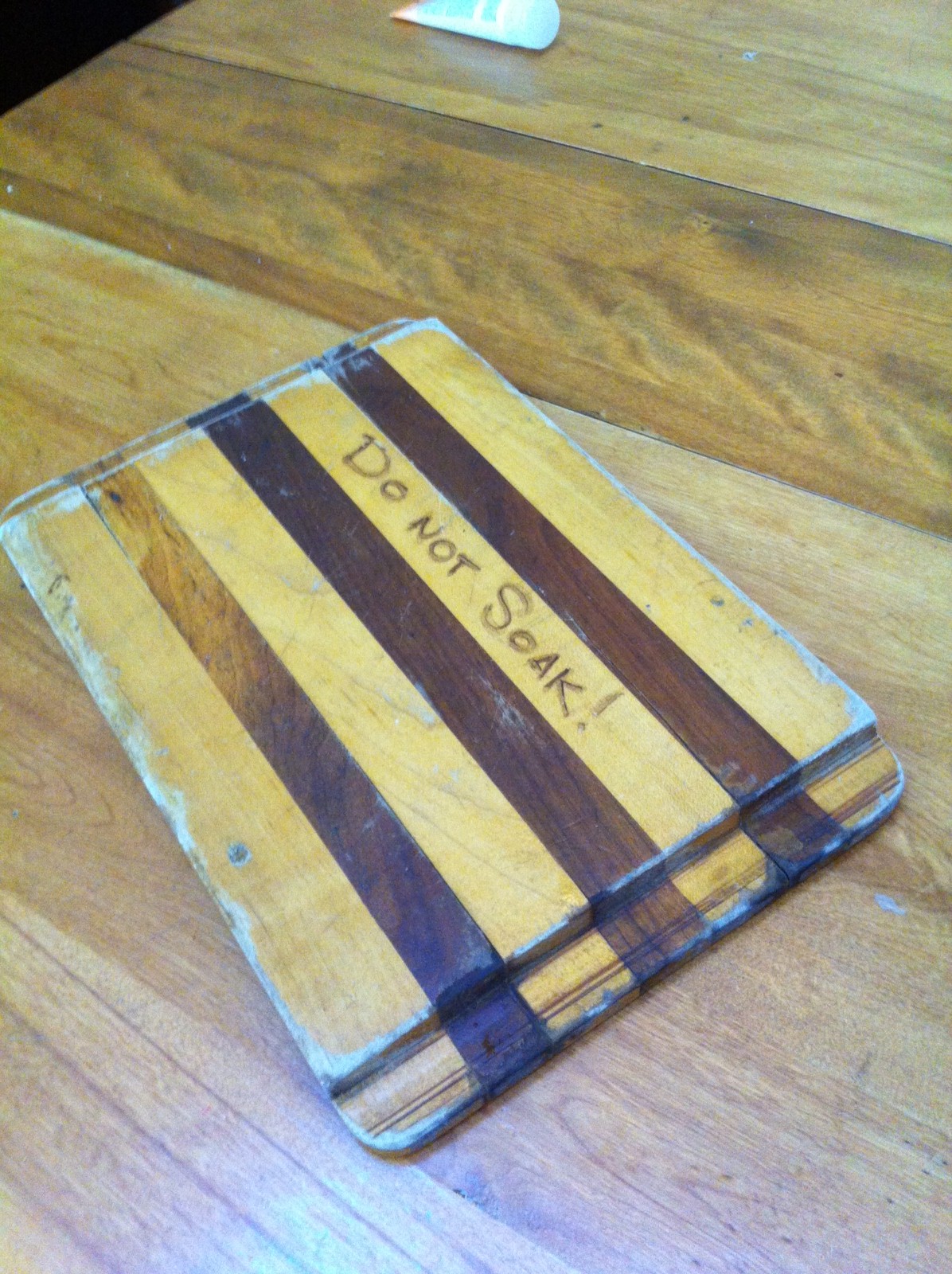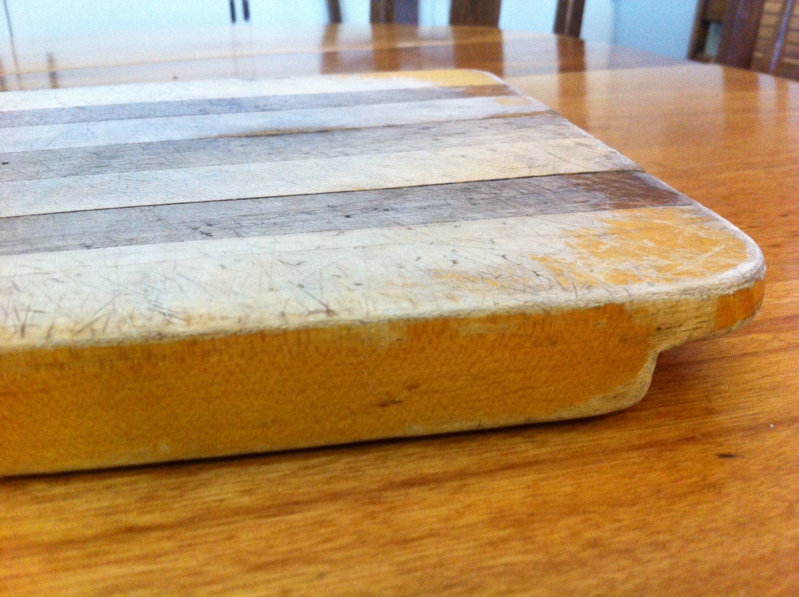 The cutting board is showing its age, but the glue lines are still tight. Mom said that my little brother did have to re-glue part of it a few years ago. It would probably respond well to a few swipes of a hand plane and some salad bowl oil. You might note it has a finish on it at the moment – probably a polyurethane – that has almost completely worn off the top, but remains on the sides and bottom. I don’t think it hurts anything being on the bottom, but if I renew the cutting surface, I’ll not replace it with more polyurethane, for obvious reasons.