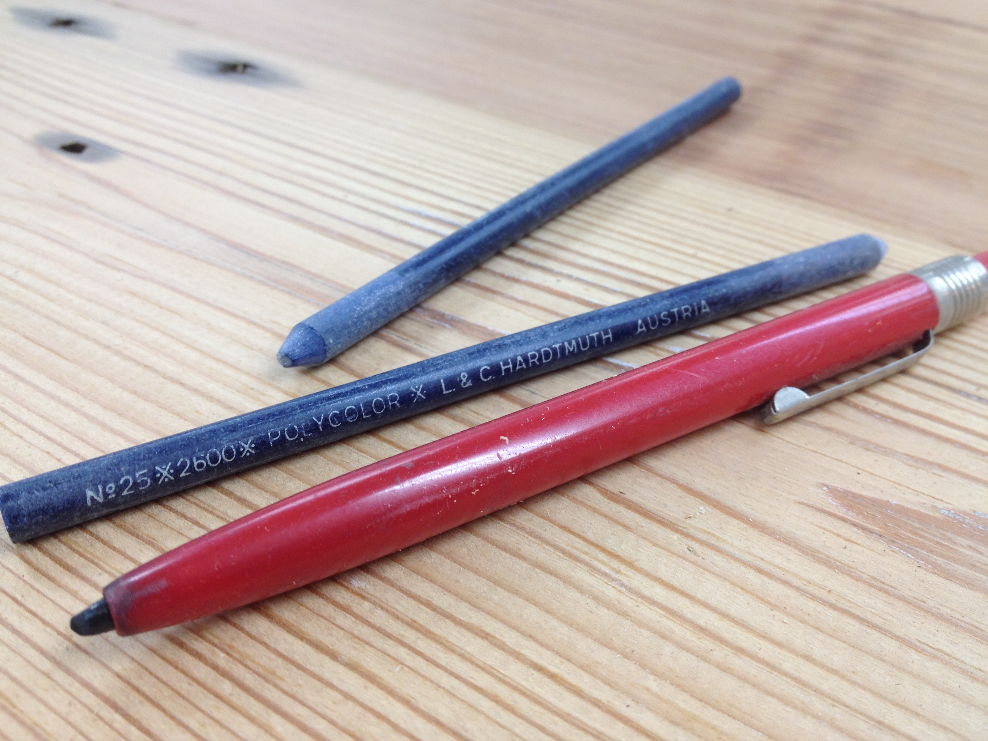 While the equipment did not fare well, I was able to salvage a good amount of his art supplies many years ago. I wasn’t being nostalgic at the time, though, I was being cheap. I needed supplies for my design and drawing classes and I had an easy source of quality materials nearby. I have an art box with pretty much all of the supplies I didn’t use up still in my basement. I use some of them in the workshop today and have found nothing better for marking on rough and finished lumber than Koh-I-Noor 2B graphite and blue polycolor sticks.
