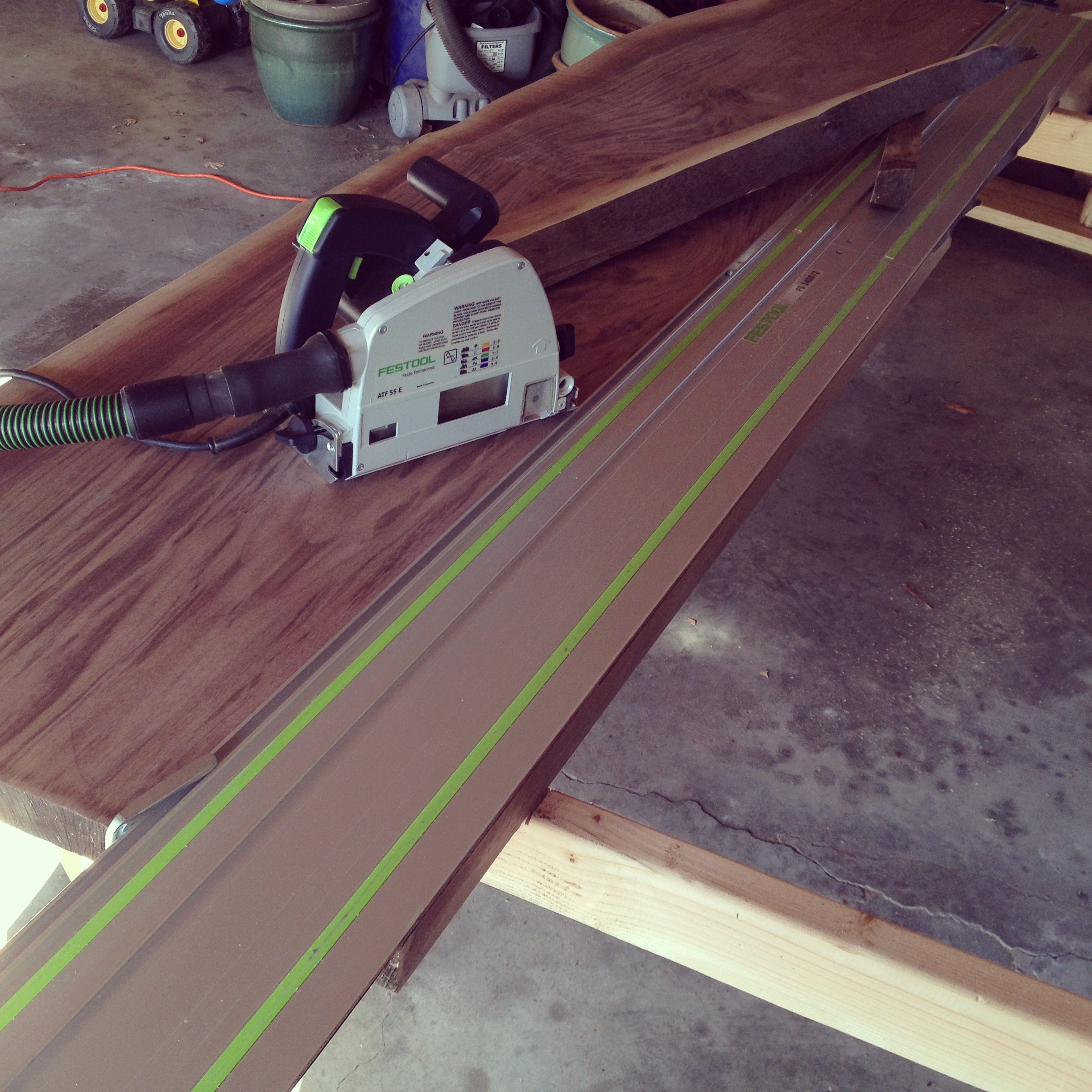 Using a Festool TS 55 (borrowed from Michael, another friend – I have some really great friends, in case I haven’t mentioned that before) I trimmed off one edge of each plank so I could join them. As discussed, I left as much sapwood as possible and kept a bit of live edge, too.